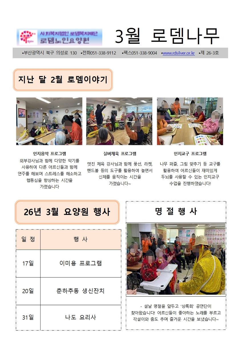 2026년 3월 소식지, 프로그램일정표 작성자 관리자 작성일 2026-03-03 14:40 조회 28 프로그램 일정은 기관 사정에 따라 변경될 수 있습니다. 좋아요 0 싫어요 0 인쇄 « 2026년 2월 소식지, 프로그램일정표 목록보기 답글쓰기 Powered by KBoard